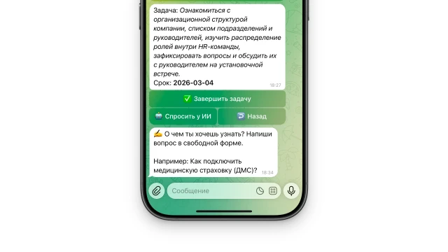 Если сотруднику что-то непонятно, AI-помощник отвечает на вопросы по базе знаний компании и помогает выполнить задачу без участия HR или наставника.