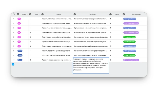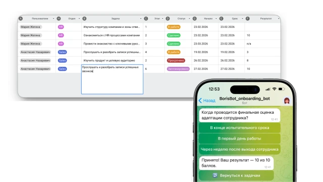 Вы загружаете в конструктор таблицу с планом адаптации по отделам: задачи, сроки, материалы, формат проверки. Это база, с которой работает бот.