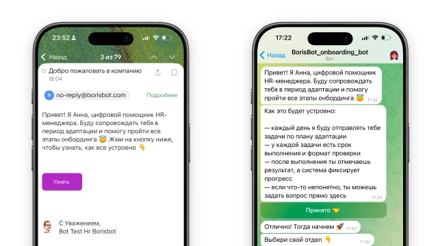 Новый сотрудник получает доступ к боту по ссылке, через QR-код или автоматически при создании в вашей системе (например, Estaff). Бот объясняет формат работы и создает индивидуальный план адаптации в зависимости от отдела.