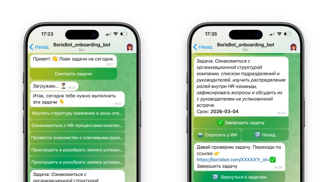 После выполнения задачи бот принимает отметку о выполнении, проводит тестирование и отправляет результат руководителю на проверку (при необходимости). Это гибкая логика, которую вы можете настроить под себя.