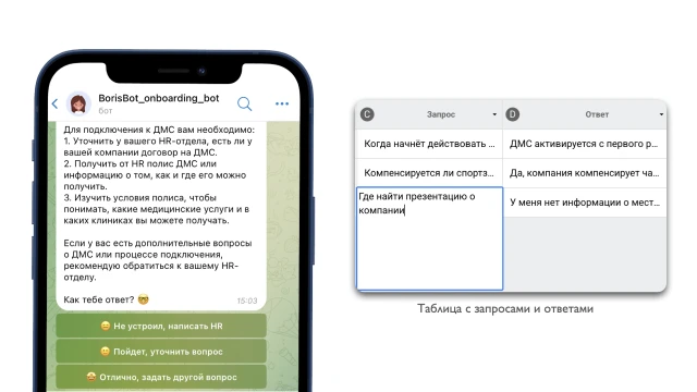 HR не нужно писать подробные сценарии — бот использует готовые материалы компании и помогает новичку самостоятельно разобраться в процессах.