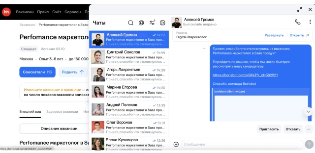 После оценки резюме бот автоматически связывается с кандидатами в чате hh.ru, по SMS или e-mail. Он задаёт уточняющие вопросы и предлагает успешным кандидатам записаться на собеседование.