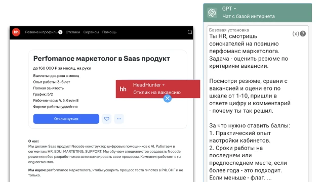 Вы размещаете вакансию на hh.ru и задаёте критерии оценки ИИ: опыт, навыки, образование и другие параметры. Бот реагирует на каждый отклик автоматически.