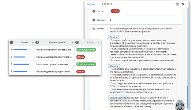 Бот получает данные из резюме и оценивает, насколько кандидат соответствует вашим требованиям. Каждое резюме получает оценку по 10-балльной шкале с пояснением, которое фиксируется в таблице.