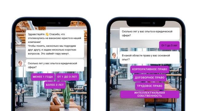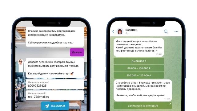 Если соискатель соответствует критериям, бот предлагает следующий шаг — записаться на собеседование или получить тестовое задание.