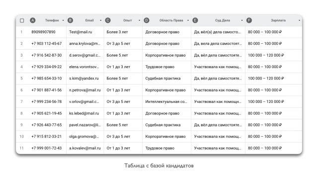 Все ответы успешных кандидатов сохраняются в таблицу, которую можно использовать на следующих этапах отбора.