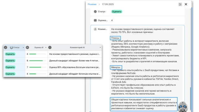 Далее подключается AI. Он анализирует данные в таблице и оценивает, насколько кандидат соответствует вашим требованиям.