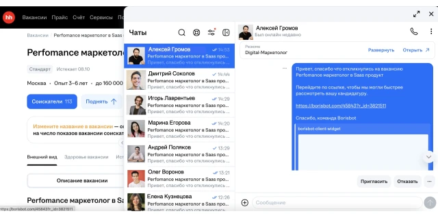 Затем вы выбираете кандидатов для следующего шага. Бот автоматически связывается с ними в чате hh.ru, по SMS или по e-mail.