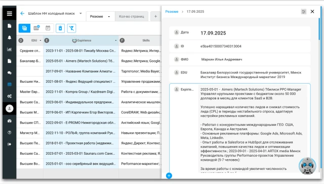 Вы запускаете автоматический поиск резюме на hh.ru, предварительно задав фильтры: образование, опыт, ключевые навыки и другие параметры. Бот находит подходящих кандидатов, забирает данные о них из hh.ru и сохраняет в единую базу.