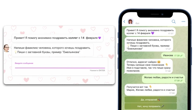 В заранее заданное время 14 февраля бот автоматически отправляет письма на корпоративную почту всем сотрудникам, получившим поздравления. В письме отображаются только пожелания, без указания отправителей.