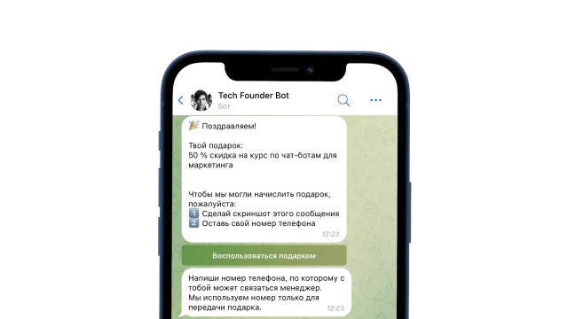 В канале или группе публикуется пост о розыгрыше с кнопкой участия. Пользователь нажимает кнопку и переходит в диалог с ботом.