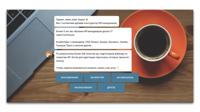 Дальше бот задает квалифицирующий вопрос, чтобы сегментировать аудиторию, и предлагает оффер под задачи и цели каждого сегмента. Это повысит конверсию в регистрации.