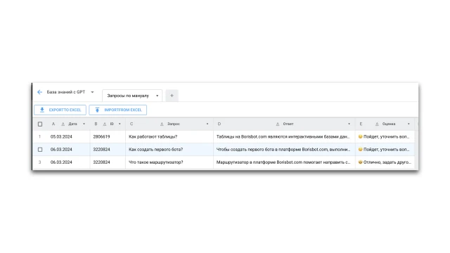 Дальше бот просит оценить полученный ответ и записывает в таблицу коммуникацию: запрос пользователя, ответ бота и оценка ответа. Это поможет анализировать работу бота, чтобы в дальнейшем дополнять базу знаний и обучать ассистента более точным ответам.