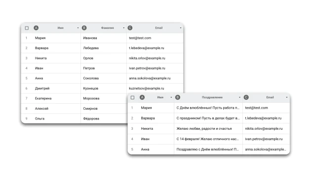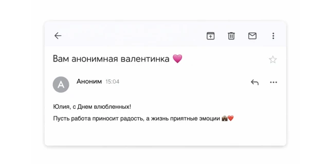 В заранее заданное время 14 февраля бот автоматически отправляет письма на корпоративную почту всем сотрудникам, получившим поздравления. В письме отображаются только пожелания, без указания отправителей.