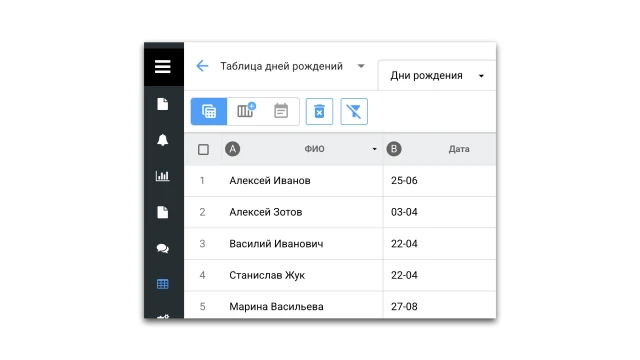 Нужно создать базу дней рождений: загрузить вашу таблицу в конструктор, внести даты вручную или запустить бота, который соберет информацию у участников и сохранит в таблицу.