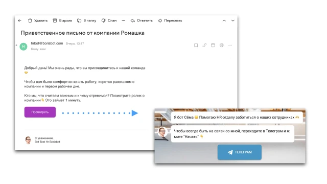 Первое письмо приходит сотруднику через пару секунд, на email из таблицы. В нем бот сообщает о начале адаптации и переводит диалог в Телеграм, где продолжит коммуникацию.