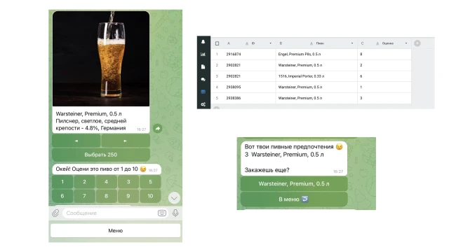 После покупки бот предлагает оценить пиво и сохраняет ответы в таблицу, чтобы составить индивидуальную карту покупателя. Клиент может посмотреть свои предпочтения за всё время: название пива и оценку, которую поставил.