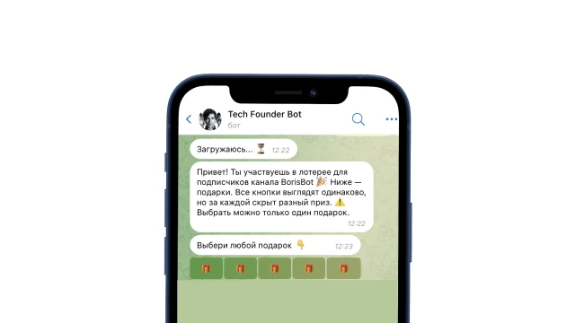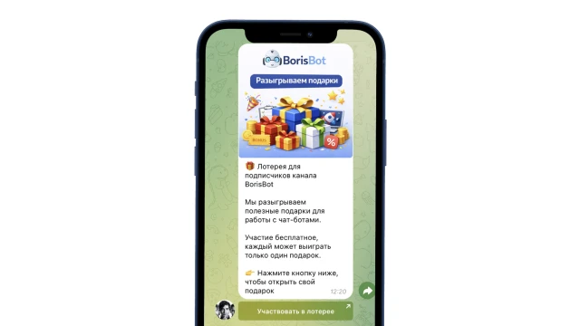 В канале или группе публикуется пост о розыгрыше с кнопкой участия. Пользователь нажимает кнопку и переходит в диалог с ботом.