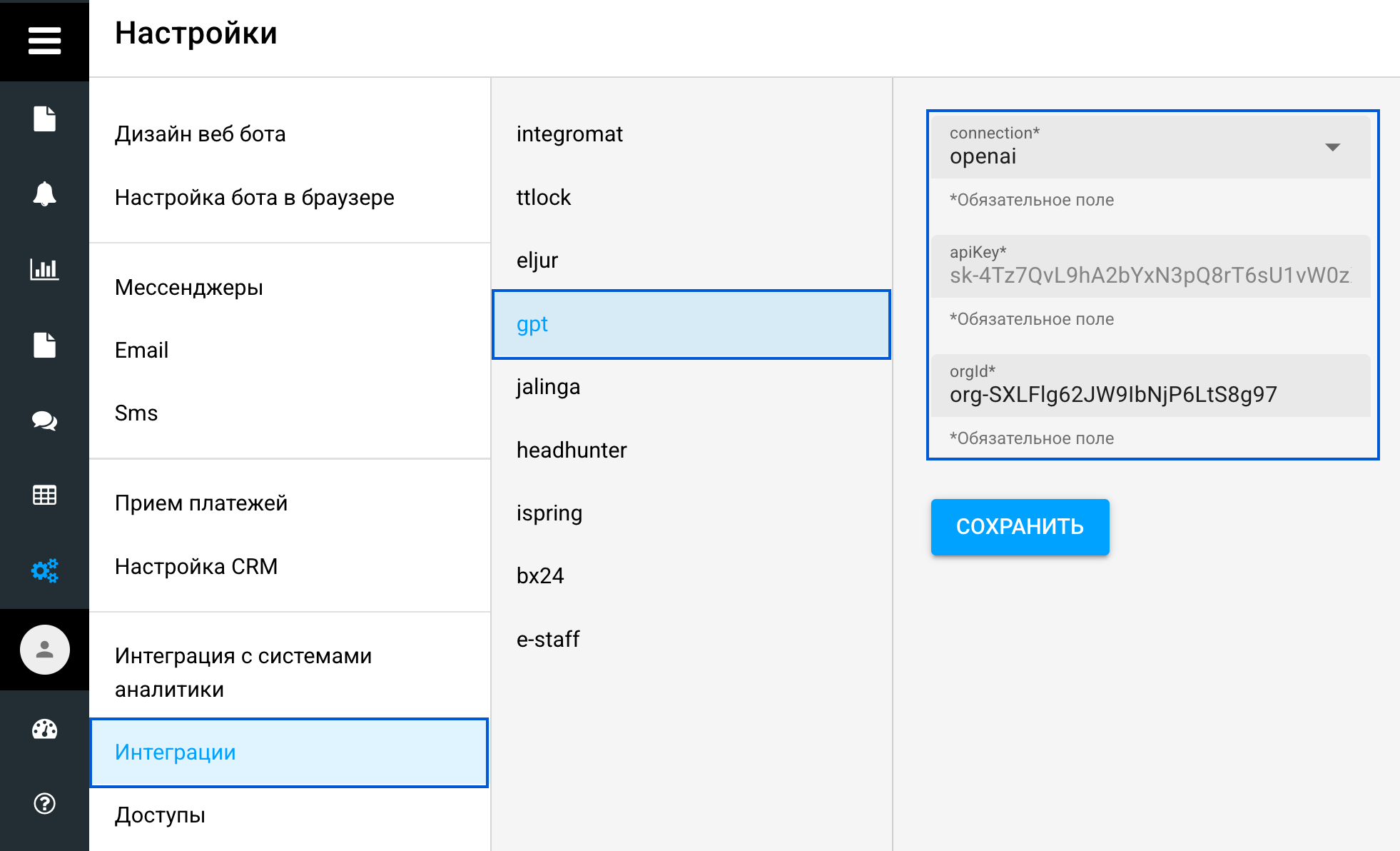 Чтобы настроить интеграцию в конструкторе, нужно получить API-ключ и данные вашей организации на сайте platform.openai.com