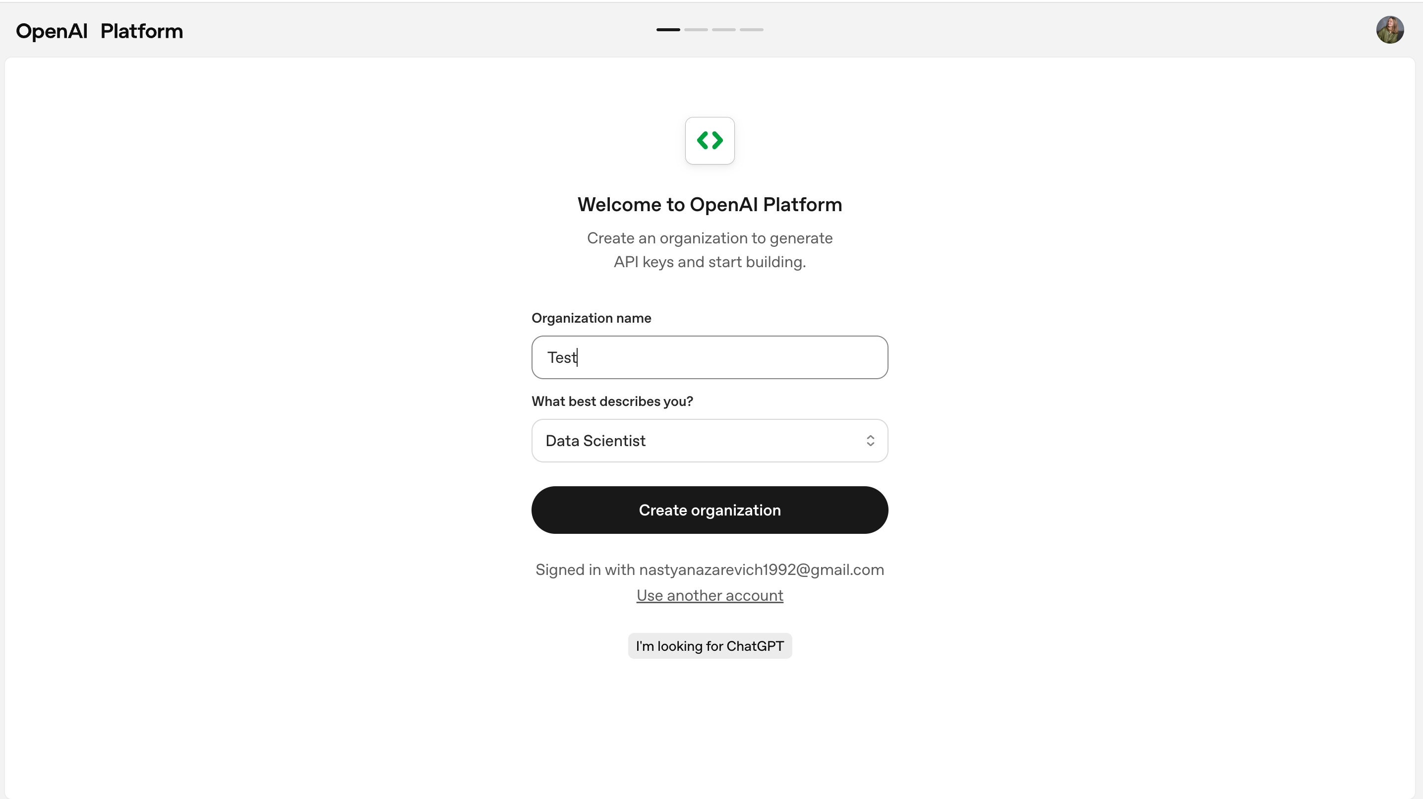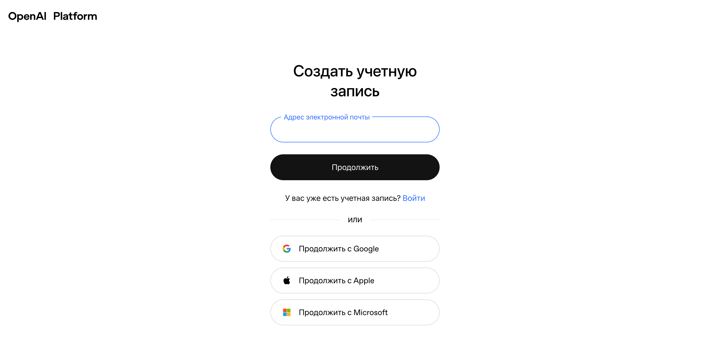 Обратите внимание: platform.openai.com — это отдельная платформа от ChatGPT. Если вы просто пользуетесь ChatGPT в браузере или приложении, этого недостаточно — зарегистрируйтесь именно на platform.openai.com.